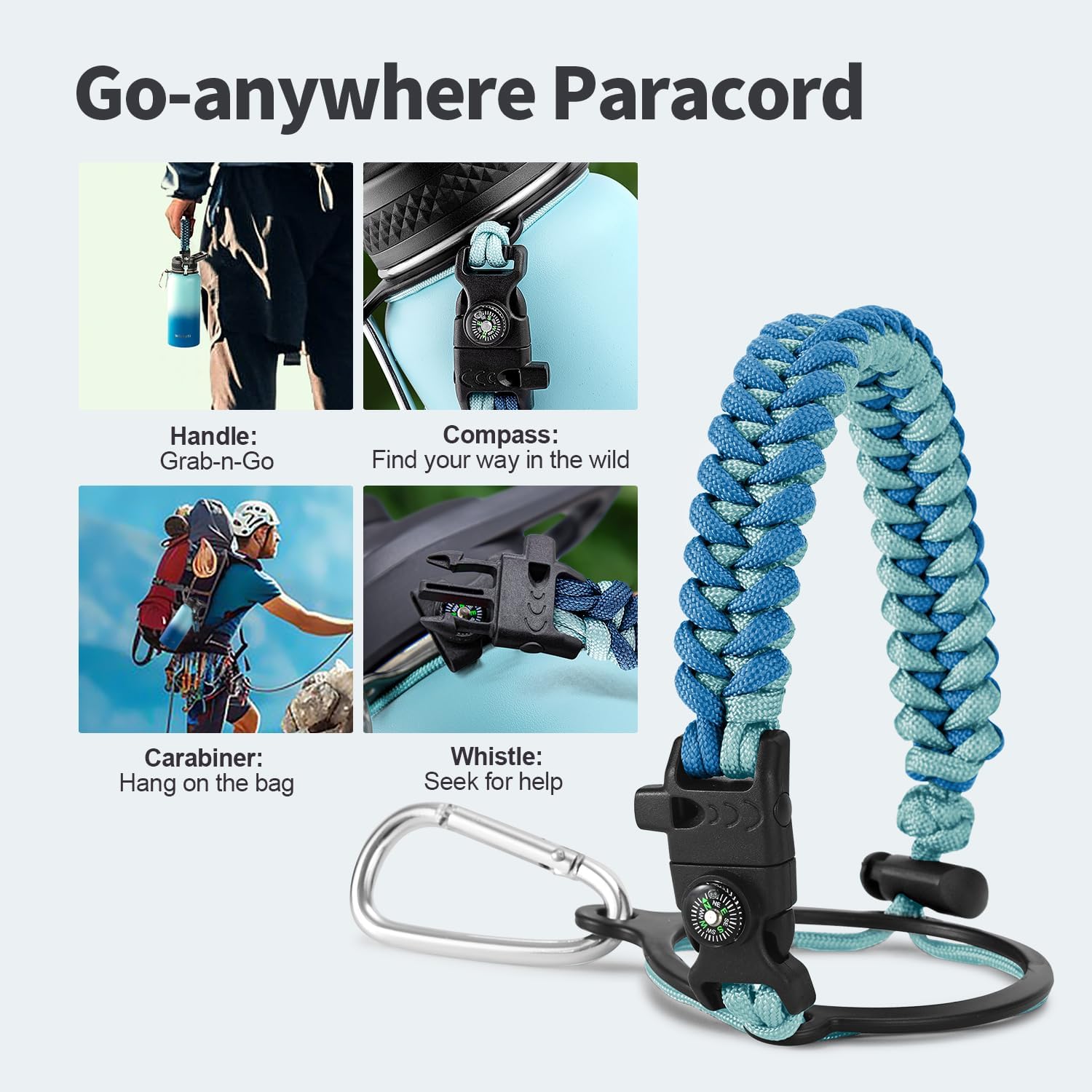 - Palm Fitting Paracord Handle: Compared to handle lids, nylon paracord on the bottle gives you more choices in terms of color coordination and coziness on your hands. Match the handle with your bottle to make a complete outdoorsy look. Compass and carabiner can be lifesavers for hiking and other expeditions