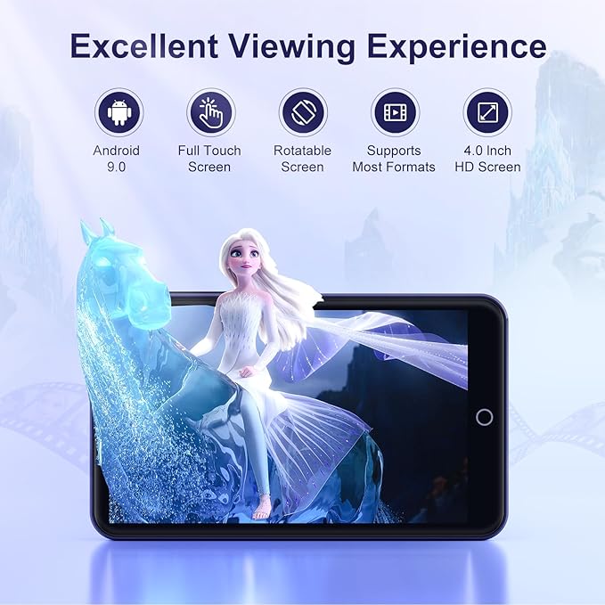 - 【High-performance MP4 Player】This wifi MP4 player is equipped with a 4" full-touch IPS screen and HiFi sound module, supports 720p, 1080p HD video playback, supported video formats are RM, RMVB, FLV, MP4, DAT, MKV, MPG, MOV, TS, and so on, can be played directly without conversion, which can bring you an unparalleled viewing experience.