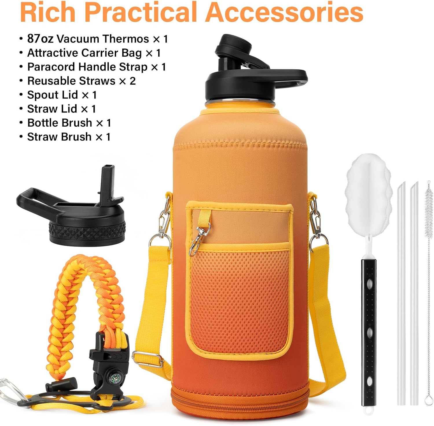 Insulated Water Bottle | Thickened Stainless Steel for Gym and Hiking with Straw, Carrier Bag, Handle Strap | BPA-Free 87 oz