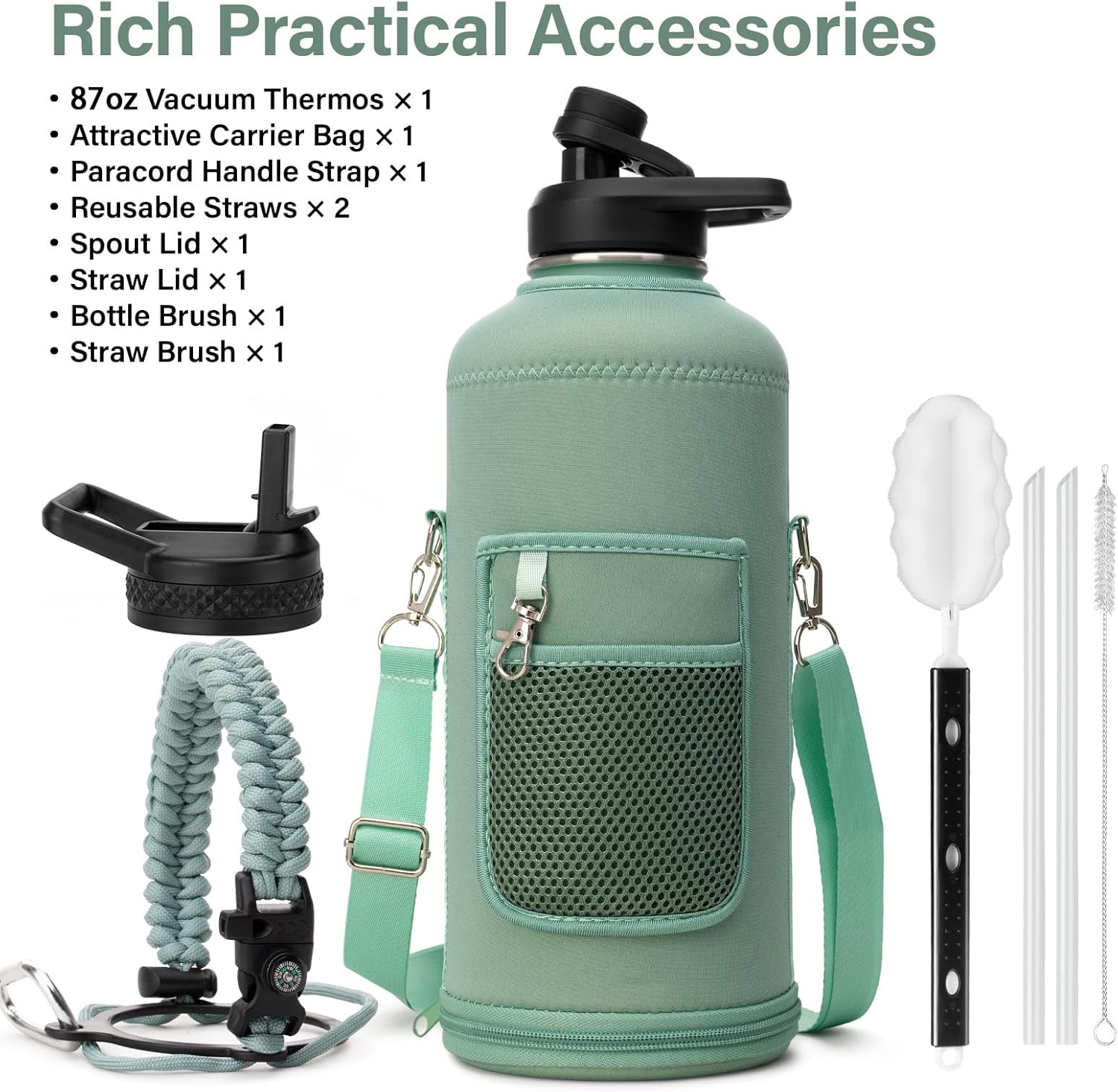 Insulated Water Bottle | Thickened Stainless Steel for Gym and Hiking with Straw, Carrier Bag, Handle Strap | BPA-Free 87 oz