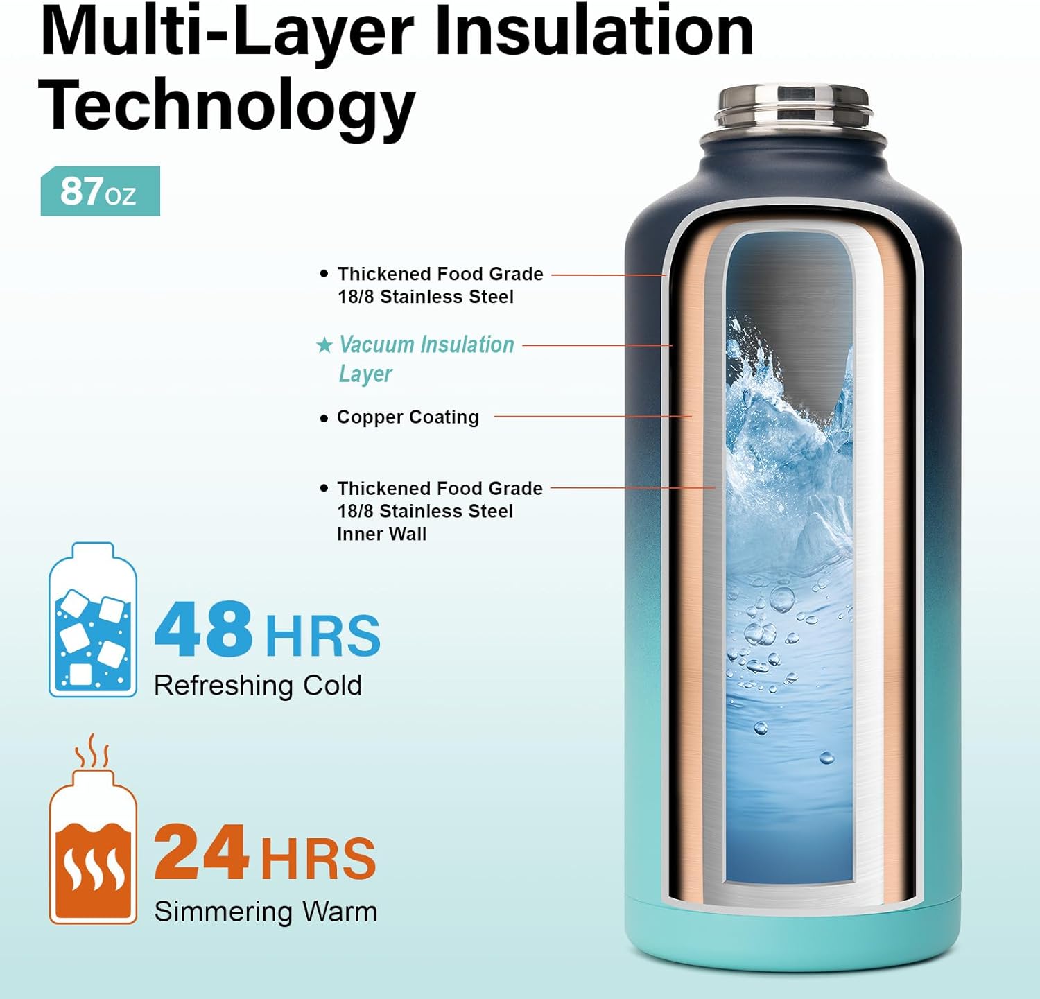 - THE MULTI-LAYER INSULATION TECHNOLOGY FEATURES: the first layer is a thick food-grade 18/8 stainless steel inner wall; the second layer has a copper plating that reduces heat transfer; the third layer is a vacuum layer that prevents heat loss. As a result, you can enjoy an insulated water bottle that keeps beverages cold for up to 48 hours and hot for up to 24 hours, making it perfect for any adventure, whether it's a long hike or a busy workday.