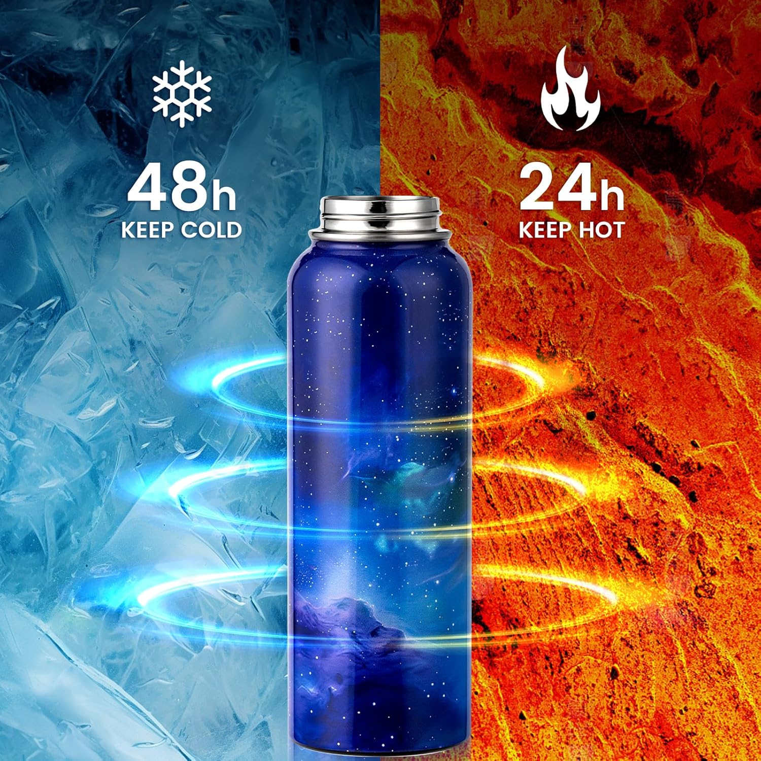 - 48H Cold & 24H Hot Triple Insulation: RAYMYLO 40 oz Insulated Water Bottle's copper-plated triple-wall vacuum design keeps drinks icy cold for 48hrs and warm for 24hrs. This Aurora Starry Sky stainless steel water bottle is designed for efficient hydration. 1/3 gallon water bottle keep icy-cold drinks at your fingertips!