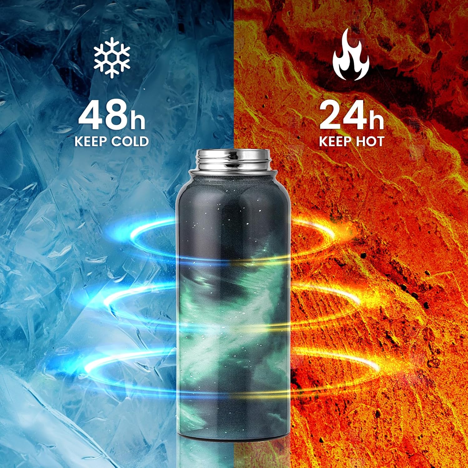 - 48H Cold & 24H Hot Triple Insulation: RAYMYLO 32 oz Insulated Water Bottle's copper-plated triple-wall vacuum design keeps drinks icy cold for 48hrs and warm for 24hrs. This Aurora Starry Sky stainless steel water bottle is designed for efficient hydration. 1/4 gallon water bottle keep icy-cold drinks at your fingertips!
