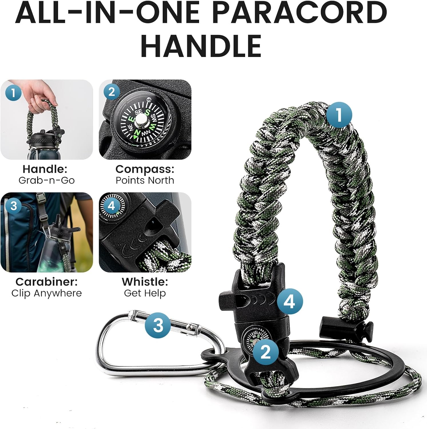 - Adventure Ready Paracord Handle: RAYMYLO 1/4 gallon water jug features a stylish color-coordinated paracord handle with a built-in compass and carabiner clip. This reusable water bottle's paracord handle is lightweight, durable, and perfect for hands-free carrying during hikes, cycling, or camping. Grab & go for spontaneous adventures under the stars!