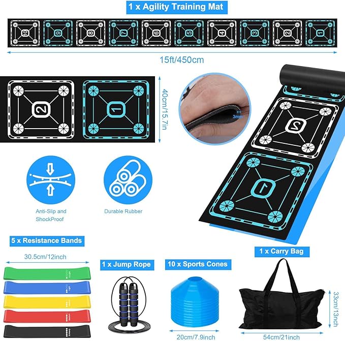 - Agility Ladder Set for Footwork Training: The speed ladder featuring 10 clearly numbered rungs and a high-contrast black & blue non-slip surface. Its 15ft/450cm long and 13.39in/34cm wide,provide enough space to agility training. Dial in your speed, enhance coordination, build explosive power, or improve lateral quickness â easily customize drills for any fitness goal, from beginner fundamentals to elite athletic conditioning.