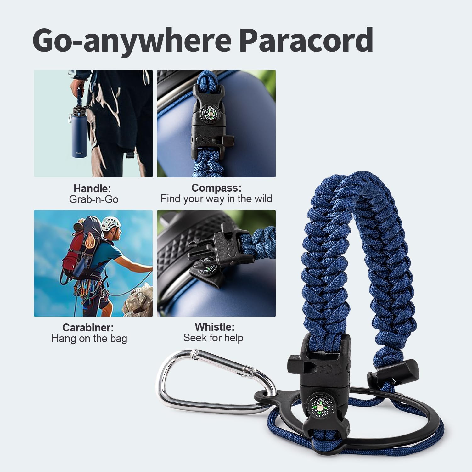 - Palm Fitting Paracord Handle: Compared to handle lids, nylon paracord on the bottle gives you more choices in terms of color coordination and coziness on your hands. Match the handle with your bottle to make a complete outdoorsy look. Compass and carabiner can be lifesavers for hiking and other expeditions