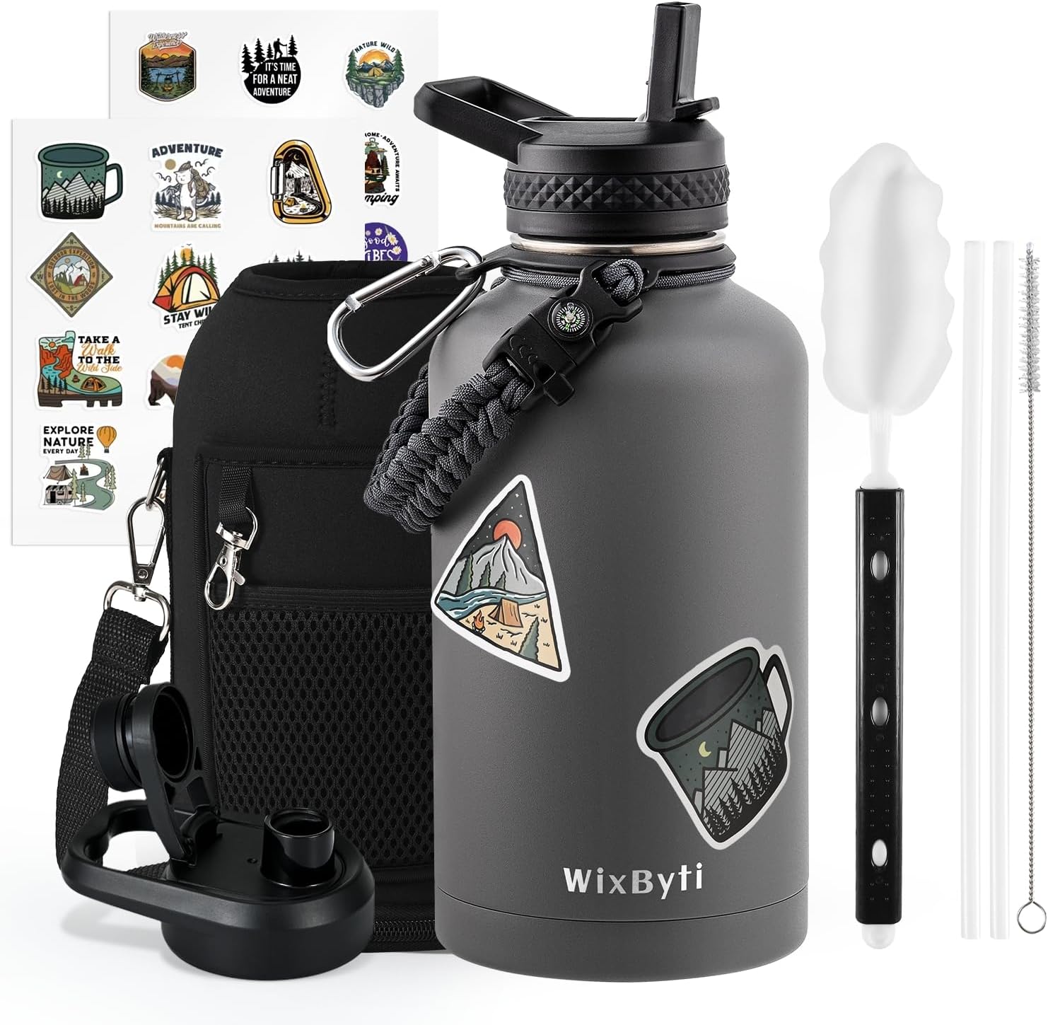 - After Services and Package: We offer continuous after-sales service against leakage and poor cold/hot-keeping capability, we are committed to 100% customer satisfaction. Your purchase includes: WixByti 64oz Water Bottle, Carrying Pouch with Adjustable Strap, Straw Lid with 2 Straws & 1 Straw Brush, Spout Lid, Paracord Handle, Water Bottle Stickers