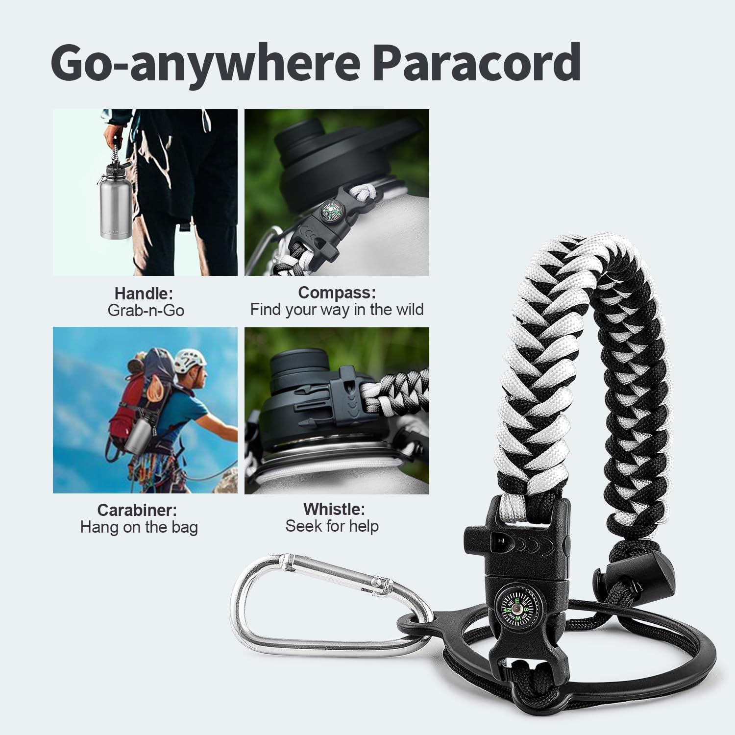 - Palm Fitting Paracord Handle: Compared to handle lids, nylon paracord on the bottle gives you more choices in terms of color coordination and coziness on your hands. Match the handle with your bottle to make a complete outdoorsy look. Compass and carabiner can be lifesavers for hiking and other expeditions