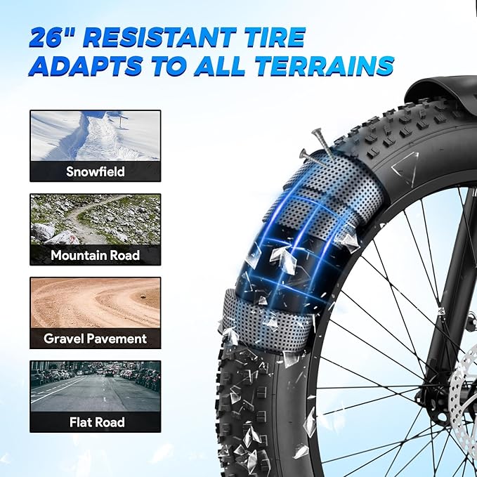 - 【ENJOY A SMOOTHER RIDE】The M2 Pro fat tire electric bike features an eMTB frame and 26'' x 4.0'' fat tire, these are designed for off-road cycling and provide excellent traction and stability on various surfaces. Additionally, its integrated button design allows for convenient control, while including front and rear lights,horn and turn signals ensuring maximum visibility and safety when riding at night.