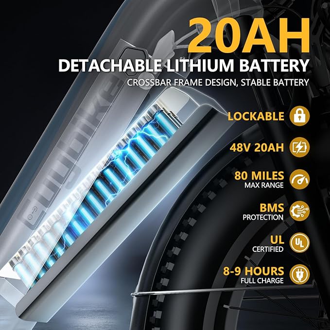 • ๐Ÿ’๐Ÿ–๐• ๐Ÿ๐ŸŽ๐€๐ก ๐‹๐จ๐ง๐  ๐‘๐š๐ง๐ ๐ž ๐‘๐ž๐ฆ๐จ๐ฏ๐š๐›๐ฅ๐ž ๐๐š๐ญ๐ญ๐ž๐ซ๐ฒ:Not only the excellent motor but also an upgraded battery equipped. The 48V 20Ah lithium-ion battery covers a range of 60-100 miles per full charge. The removable battery design makes charging more convenient. Dustproof and dampproof, guarantee the safety and life of the battery. Effortlessly cruise, exercise, or commute seamlessly with this long range e-bike.