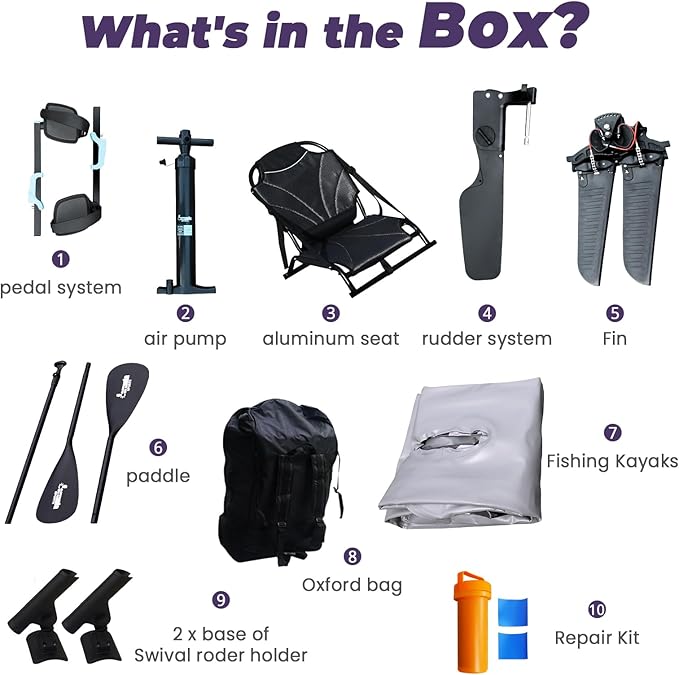 - Packing List: 1x Inflatable kayak, 1 x air pump, 1 x pedal system, 1 x rudder system, 1 x paddle, 1 x aluminum seat, 1 x Fin, 1 x Repair kit, 1 x large-capacity oxford cloth storage bag, 2 x base of Swival roder holder